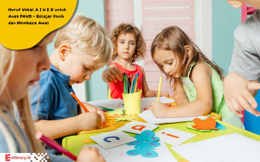 Fokus: pengenalan lima huruf vokal utama dalam alfabet, cara pelafalan, contoh kata dasar, serta latihan fonik sederhana untuk anak PAUD.