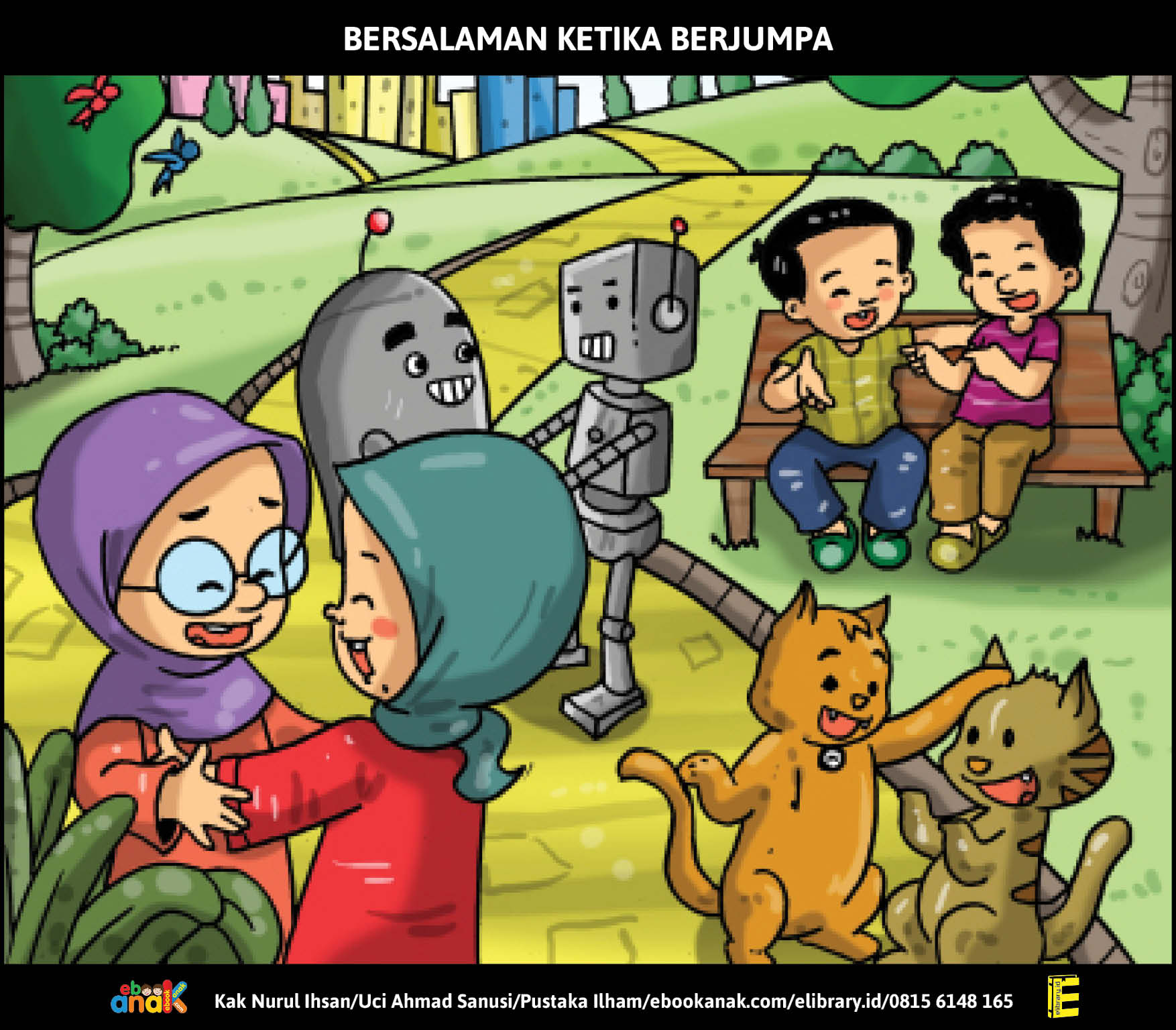 Ali, Alia, Memeng, dan Bipbip robot bertemu teman-teman di taman kota.