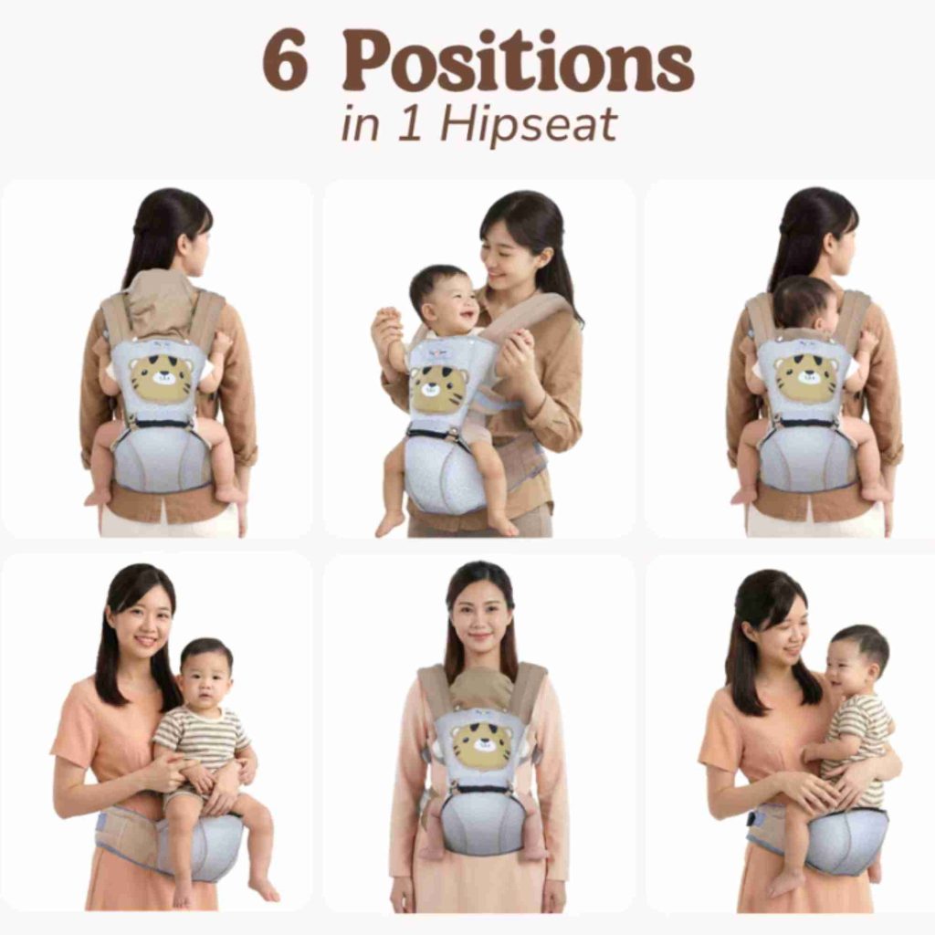 - Menggendong dengan Alas Hipseat Saja: Tanpa tali punggung, hipseat berfungsi sebagai dudukan pinggul yang memudahkan bayi melihat sekeliling. Cocok untuk jalan-jalan santai di dalam rumah atau lingkungan sekitar.