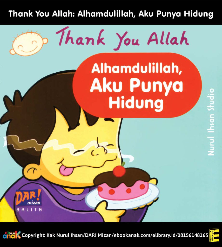 Karena aku punya hidung, aku bisa menghirup udara segar. Terima kasih, ya Allah. Alhamdulillah…. Buku yang berjudul Alhamdulillah, Aku Punya Hidung ini, mempunyai beberapa manfaat, di antaranya; Mengenali fungsi hidung sebagai bagian tubuh yang sangat bermanfaat. Sambil membaca cerita ini, Anda bisa menyodorkan makanan kecil kepada anak Anda. Lalu mintalah ia mencium bau makanan tersebut. Nah, ia akan mengetahui bau-bauan,